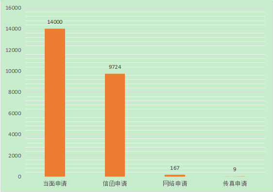 2015年,全市各级行政机关共受理政府信息公开申请23900件,数量比上一年度大幅增长,其中市级行政机关322件,各县(市、区)23578件。申请渠道方面,当面申请是最主要的申请形式(14000件,占58.5%),其余依次为信函申请(9724件)、网络申请(167件)和传真申请(9件),详细情况如图5所示。