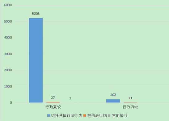 2015年,全市共受理有关政府信息公开复议案件5231件,其中维持具体行政行为5203件,被依法纠错27件,其他情形1件。全市各级人民法院共审理与政府信息公开行政诉讼案件213件,其中维持具体行政行为或者驳回原告诉讼请求数202件,被依法纠错11件,其他情形0件,详细情况见图6所示。