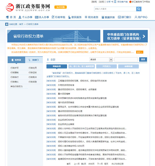 一是推进行政权力清单动态管理信息公开。2014年10月,我省在浙江政务服务网正式向社会公布了完整的省市县三级政府部门权力清单,实现了省市县权力清单三级联网并在一张网上同台亮相。2015年,我省重点推进行政权力清单动态调整,下发了《浙江省人民政府办公厅关于印发浙江省政府部门权力清单管理办法的通知》(浙政办发〔2015〕109号),明确了依托浙江政务服务网建立全省行政权力事项库,实行权力清单动态管理,确保“法无授权不可为”“清单之外无职权”,加强对行政权力运行的制约和监督。42个省级部门保留4236项行政权力,精简后保留下来的行政权力包括省级部门直接行使的权力1973项、全部委托下放和实行市县属地管理的权力2255项、省级有关部门共性权力8项,均在浙江政务服务网上予以公开。全省11个设区市政府对照《省市县三级行政权力基本目录》,进一步做好行政权力事项信息比对规范和信息内容完善工作,及时公开权力清单动态调整情况。依托浙江政务服务网统一权力运行系统,实时公布行政许可、行政确认、审核转报、备案、年检等各类权力事项的受理、进展情况和办理结果信息。二是推进行政审批信息和服务信息公开。重点对全省的行政审批事项和行政许可事项作进一步清理,先后下发了《浙江省人民政府办公厅关于公布取消和调整行政审批事项目录的通知》(浙政办发〔2015〕50号)、《浙江省人民政府办公厅关于公布全省行政许可事项目录(2015年)的通知》(浙政办发〔2015〕93号)。同时,在网上公开各级政府部门行政审批办件的过程信息。三是推进行政处罚案件信息公开。严格按照《浙江省行政处罚结果信息网上公开暂行办法》(省政府令第332号)规定,全面推行行政处罚结果信息网上公开。截至目前,全省各地、各部门在浙江政务服务网上公开的行政处罚结果信息590811条,其中省级部门公开338条。