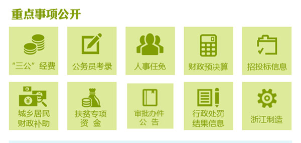 根据《国务院办公厅关于印发2015年政府信息公开工作要点的通知》(国办发〔2015〕22号)精神,我省高度重视,为全面部署我省2015年政府信息公开工作,认真抓好贯彻落实,下发了《浙江省人民政府办公厅关于印发2015年政府信息公开工作要点的通知》(浙政办发〔2015〕60号),对全省行政权力清单、行政处罚、财政资金、公共资源配置、重大建设项目、公共服务、国有企业、公共监管等8个重点领域的政府信息公开工作提出了细化要求,尤其是依托浙江政务服务网,按照行政权力集中进驻、网上服务集中提供、政务信息集中公开、数据资源集中共享的总体要求,明确责任单位,推动政府信息公开工作的落实和提高。