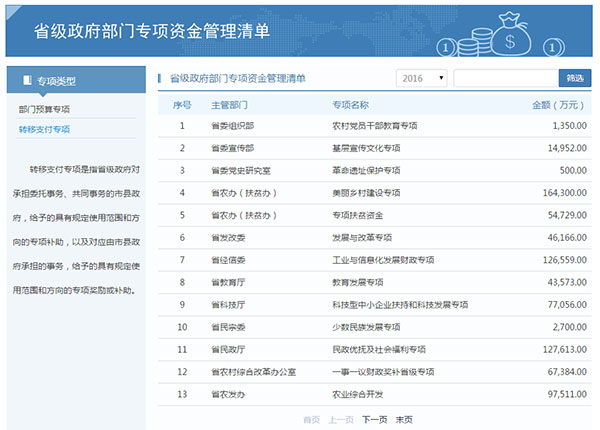 本级政府“三公”经费预决算汇总情况,本级政府部门的财政资金预决算和“三公”经费预决算情况。省级单位中有93个公开了预算情况、90个公开了“三公”经费预算情况,公开内容全部按支出功能分类细化到项级。除涉密单位、中央单位和企业外,省级单位已公开预算情况的占省级预算单位总数的93%,其中政府部门公开率为100%。大力推进专项资金和地方政府债券发行信息公开。在浙江政务服务网上设置“省级政府专项资金管理清单”,向社会公布了2015年省级专项资金的项目名称、项目总费用等信息43条。深化财政预算执行等重要专项审计结果信息公开,公开了2014年度省本级预算执行和全省其他财政收支的审计工作报告、浙江省部分小额贷款公司2014年度经营风险专项审计调查结果、世界银行贷款项目执行情况审计结果、浙江省2014年对口支援新疆阿克苏发展资金和项目跟踪审计结果等信息。
