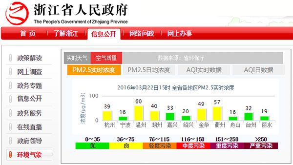 7.推进环境保护信息和环境监管执法信息公开。推进空气、水环境质量信息公开,实时发布全省153个空气质量监控点位空气质量指数(AQI)值及未来24小时的空气质量预报,以及全省81个建有水质自动监测站的饮用水水源地的水质自动监测更新信息。建立浙江省企业自行监测信息公开平台,每季度上网公布重点污染源监督性监测报告,每月公布30万千瓦以上火电厂监督性监测数据及超达标情况。加大环境执法检查依据、内容、标准、程序和结果公开力度,公开挂牌督办信息4条。公开违法违规单位及行政处罚决定书,加强突发环境事件信息公开。