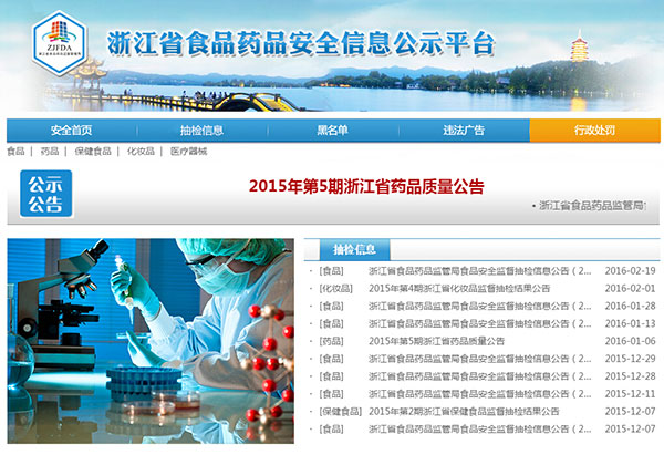设立浙江省食品药品安全信息公示平台,集中发布食品药品“黑名单”、产品质量抽验、行政处罚案件和药品、医疗器械、保健食品违法广告等4类信息47期3300多条。公开对社会产生重大影响的食品药品典型案件20件,及时发布食品药品专项整治信息147条、保健食品消费警示信息12条。