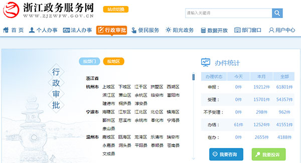 一是全面推进行政权力在线运行。建成覆盖全省的行政权力目录库,实现对省市县三级4000余个政府部门、累计40余万项在用行政权力事项的规范比对和动态管理。按照统一认证、统一申报、统一查询的要求,全面实现省市县三级行政审批事项的一站式运行,累计已受理一站式办件305万件,省级部门行政处罚等其他8类行政权力事项也将于2015年底前后基本实现网上运行。全省统一的电子监察系统完成升级改造,对300余万件审批办件进行全流程监督,并通过网络和短信,提示办事对象进行满意度评价,已收到的回复反馈对总体办理满意度达到99%。积极开展行政流程优化再造,建立网上政务服务“五星级”评价体系,推动部门提高网上办事便捷程度,截至2015年底,全省纳入政务服务网办理的服务事项中,来自互联网申报的办件已占总量的27%。同时,在杭州、温州、金华等地和省财政厅、省公安厅等部门相继开展证照“网上申请、快递送达”“网上开证明”试点工作,着力打通网上全流程办事的“最后一公里”。依托浙江政务服务网平台深入推进跨部门并联审批,开展审批中介网上超市、网上网下多级联动等试点工作。省级投资项目在线监管平台已实现与国家平台对接。全省“五证合一”商事登记制度改革工作全面开展,截至2015年底已依托浙江政务服务网办理“五证合一”证照32万余张。