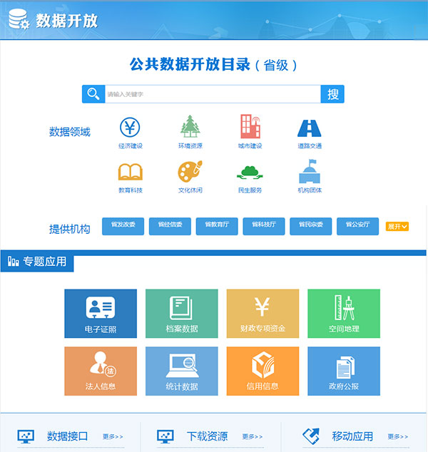 四是促进政务信息资源共享开放。基于各级政务服务网,深化基础数据库和专业数据库建设,目前已形成涵盖5896万人的实有人口库和249万家各类法人的法人基础库,建设集成6.9万个办事机构和公共场馆的空间地理位置信息平台,形成便民服务一张图。完善社会信用数据库,打造统一的社会信用信息公示平台,建设全省统一的电子证照库,集纳37个省级部门、860万条电子证照数据,为跨部门业务协作提供数据比对、查询等服务。建立统一的政务信息资源共享交换体系,完成省级政务信息资源目录梳理工作,在全国率先推出政府数据统一开放平台,面向社会公众和创客群体开放68个省级单位、41个杭州市级单位提供的650项数据类目,其中包含295项可下载的数据资源和187个数据接口。建设综合监测分析平台,已形成财政专项资金管理、经济运行监测、地理空间数据管理等系统。此外,政务云平台全面启用,电子政务外网备网、视联网等网络基础设施建设全面启动,政务网站集约化建设试点工作积极推进。