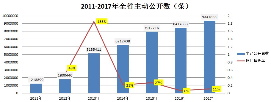 2017年度浙江省主动公开政府信息9341853条,同比增长11%。其中各设区市和县级政府及设区市级政府部门主动公开政府信息8517780条,同比增长16%;省级政府部门主动公开政府信息997784条,同比降低7%。全省通过政府网站公开政府信息2797179条,政务微博公开政府信息642174条,政务微信公开政府信息528671条,其他方式公开政府信息513228条。