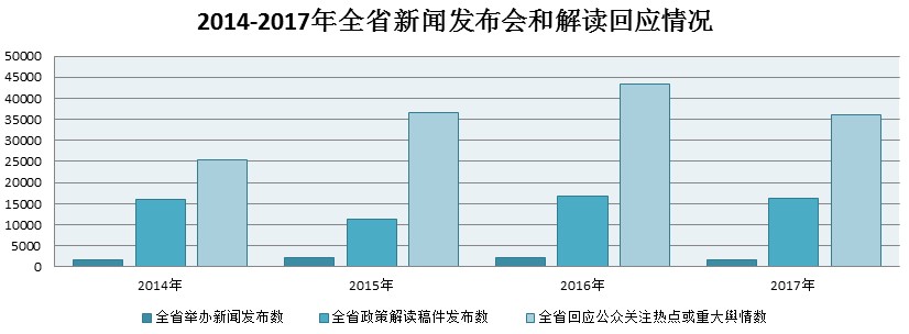 2017年,省政府及各市政府召开新闻发布会1750场,较2016年下降17%。其中,省政府及省级部门召开新闻发布会190场,各市政府召开新闻发布会1560场,各市主要负责同志参加新闻发布会达810人次。全省发布各类政策解读稿件16216篇,比2016年的16850篇减少634篇。全省参与政府网站在线访谈1448人次,比2016年增加27%。全省通过微博微信回应事件数达93610次,比2016年增加3.9%;以其他方式回应事件数达122649次。全省回应公众关注热点或重大舆情共35945次,其中,省级部门193次,各市政府及其部门35752次。