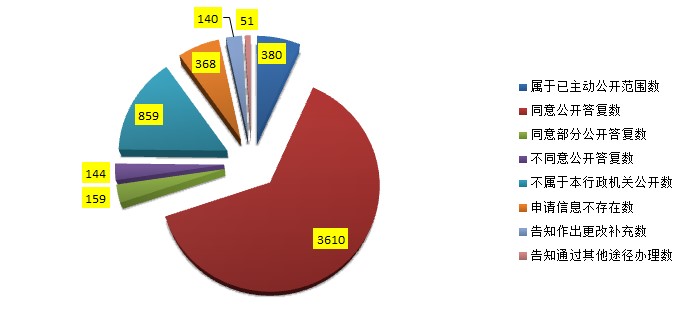 目前,全省所有依申请公开政府信息都已在《条例》规定的期限内全部办理完毕,并以申请人要求的方式答复申请人。属于已经主动公开的为2981件,同意公开的为12940件,部分公开的为2174件,其公开率占全部申请的57%;不同意公开的共有2333件,占7%;不属于本行政机关公开的5084件,占16%;告知申请信息不存在的4130件,占13%;申请内容不明确作出更改补充的1315件,占4%;告知通过其他途径办理的922件,占3%。