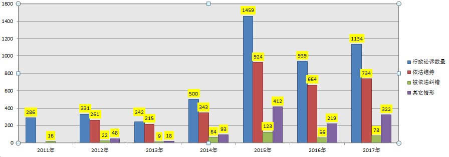 全省法院系统共受理有关政府信息公开的行政诉讼案件1134件,比2016年上升111件。其中,维持具体行政行为或驳回原告讼诉请求的734件,占65%;被依法纠错的78件,占7%;其他情形的322件,占28%。行政争议主要集中在大宗商品交易、土地征用、房屋拆迁等方面。