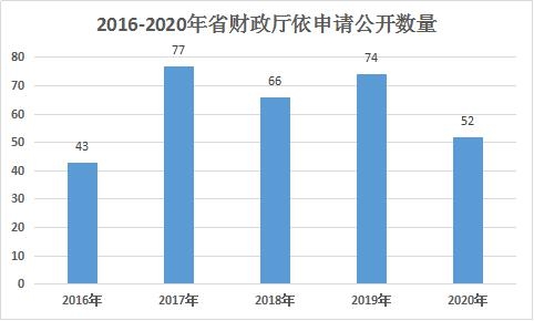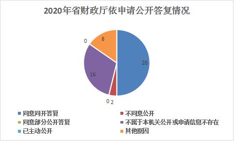 2020年,省财政厅共收到依申请公开52件,按照规范流程,严把受理关、办理关、答复关,其中同意公开答复26件、不同意公开2件、同意部分公开答复0件、不属于本机关公开或申请信息不存在16件、已主动公开0件、其他原因8件,全部依法办理完毕。