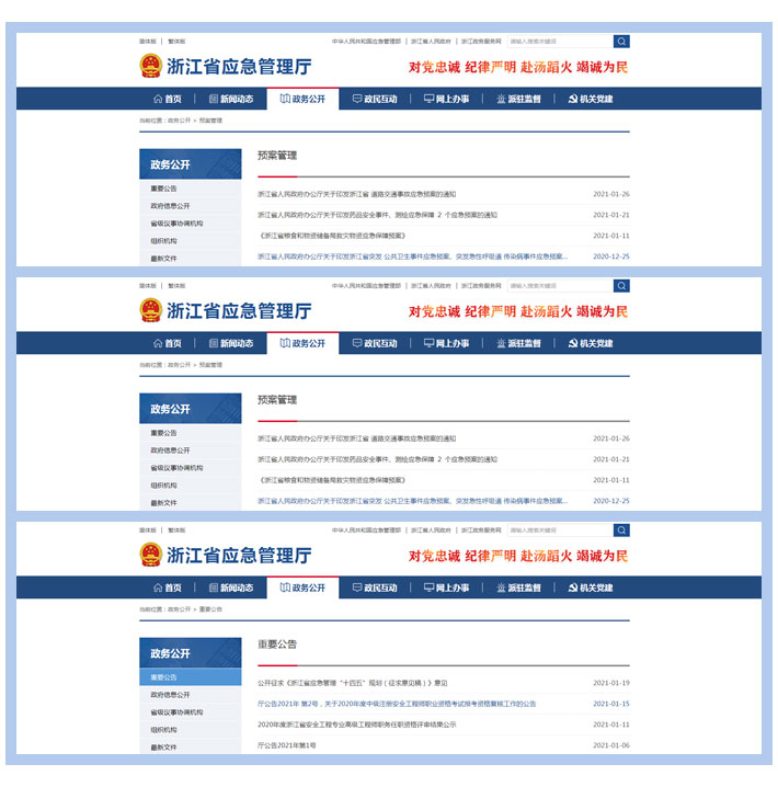 (四)加强信息平台建设。认真落实《国务院办公厅政府信息与政务公开办公室关于规范政府信息公开平台有关事项的通知》(国办公开办〔2019〕61号)要求,进一步规范网站建设,梳理调整法定主动公开内容和目录,增设应急管理特色栏目,搭建网民互动交流平台,增强网站的可读性、互动性,让民众更了解、关注和支持应急管理工作。根据《浙江省政府网站信息发布格式规范操作说明》和第三方评估指导,完成网站所有栏目信息的调整补充,对网站信息内容发布、咨询和投诉、政务服务等28个项目的内容进行了纠错提升。