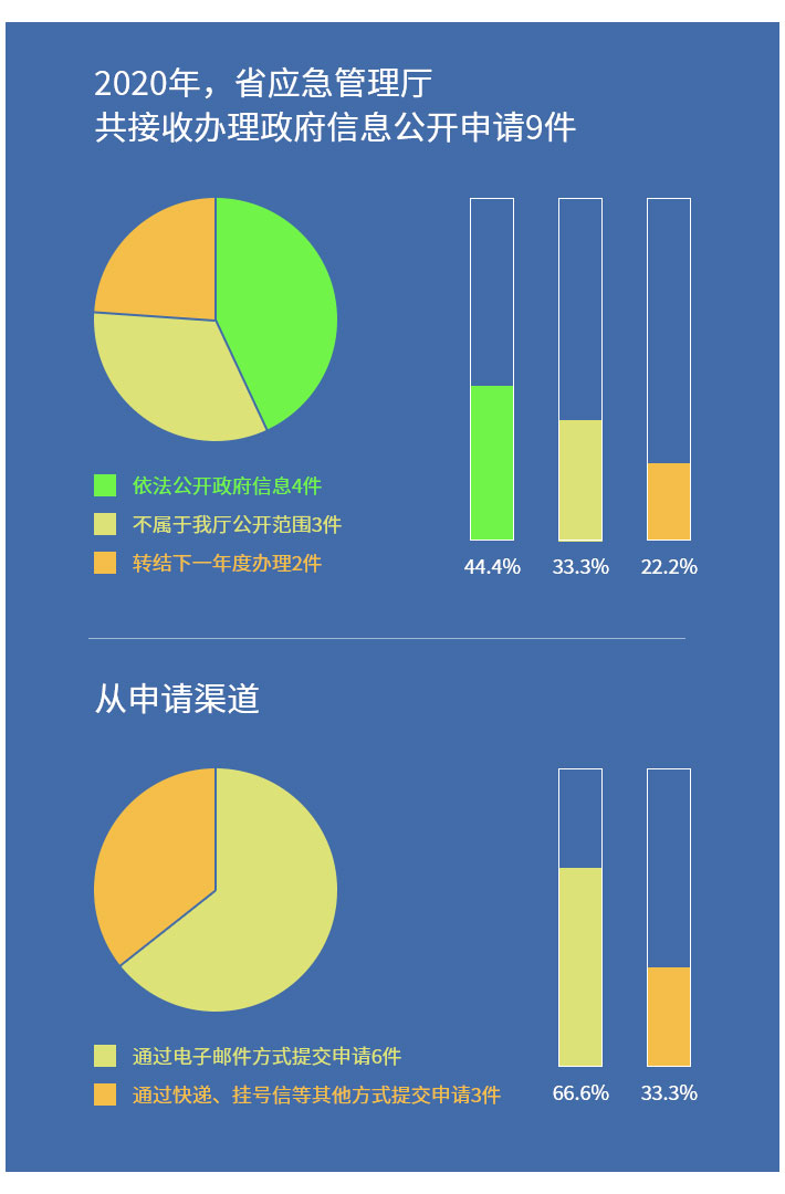(五)做好依申请公开工作。规范完善依申请公开件接收、登记、审核、办理、答复、归档等闭环管理机制流程,不断提高答复专业化法治化水平。2020年,共接收办理政府信息公开申请9件,全部按规定完成答复工作,未出现超期情况。依法公开政府信息4件,不属于我厅公开范围3件,结转下一年度办理2件。从申请渠道看,通过电子邮件方式提交申请6件,通过快递、挂号信等其他方式提交申请3件。