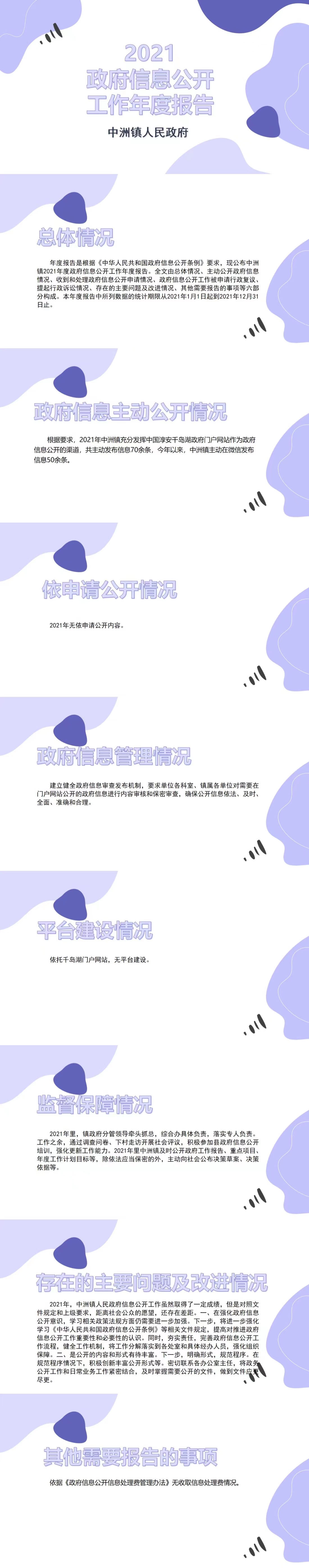 年度报告是根据《中华人民共和国政府信息公开条例》要求,现公布中洲镇2021年度政府信息公开工作年度报告。全文由总体情况、主动公开政府信息情况、收到和处理政府信息公开申请情况、政府信息公开工作被申请行政复议、提起行政诉讼情况、存在的主要问题及改进情况、其他需要报告的事项等六部分构成。本年度报告中所列数据的统计期限从2021年1月1日起到2021年12月31日止。