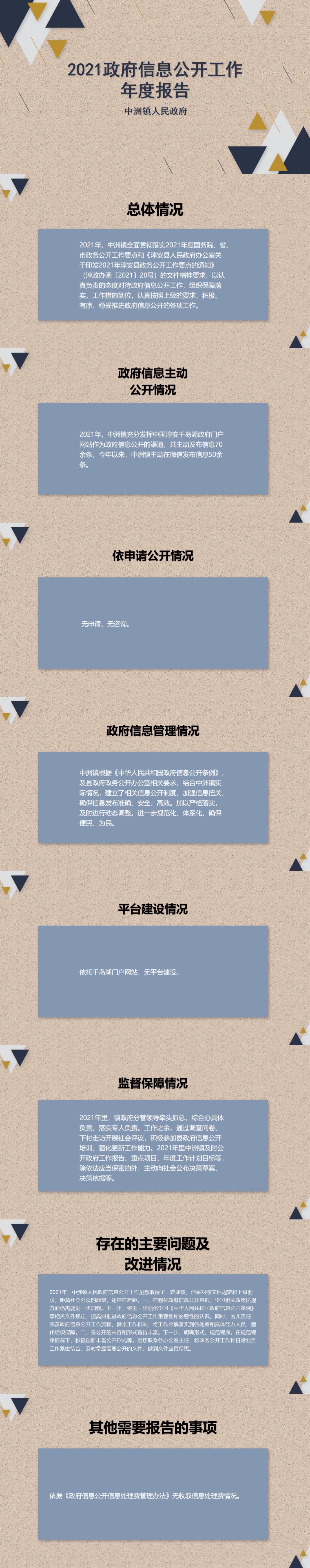 根据要求,2021年中洲镇充分发挥中国淳安千岛湖政府门户网站作为政府信息公开的渠道,共主动发布信息70余条,今年以来,中洲镇主动在微信发布信息50余条。