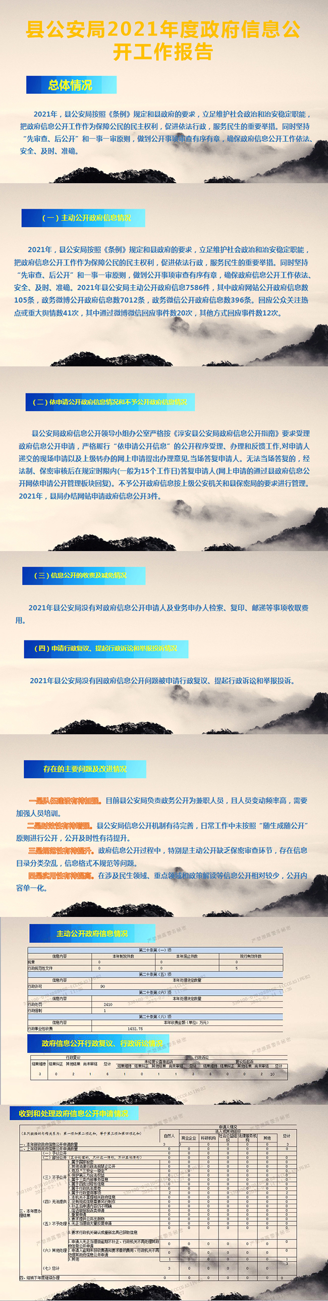 (一)主动公开政府信息情况。2021年,县公安局按照《条例》规定和县政府的要求,立足维护社会政治和治安稳定职能,把政府信息公开工作作为保障公民的民主权利,促进依法行政,服务民生的重要举措。同时坚持“先审查、后公开”和一事一审原则,做到公开事项审查有序有章,确保政府信息公开工作依法、安全、及时、准确。2021年县公安局主动公开政府信息7586件,其中政府网站公开政府信息数105条,政务微博公开政府信息数7012条,政务微信公开政府信息数396条。回应公众关注热点或重大舆情数41次,其中通过微博微信回应事件数20次,其他方式回应事件数12次。