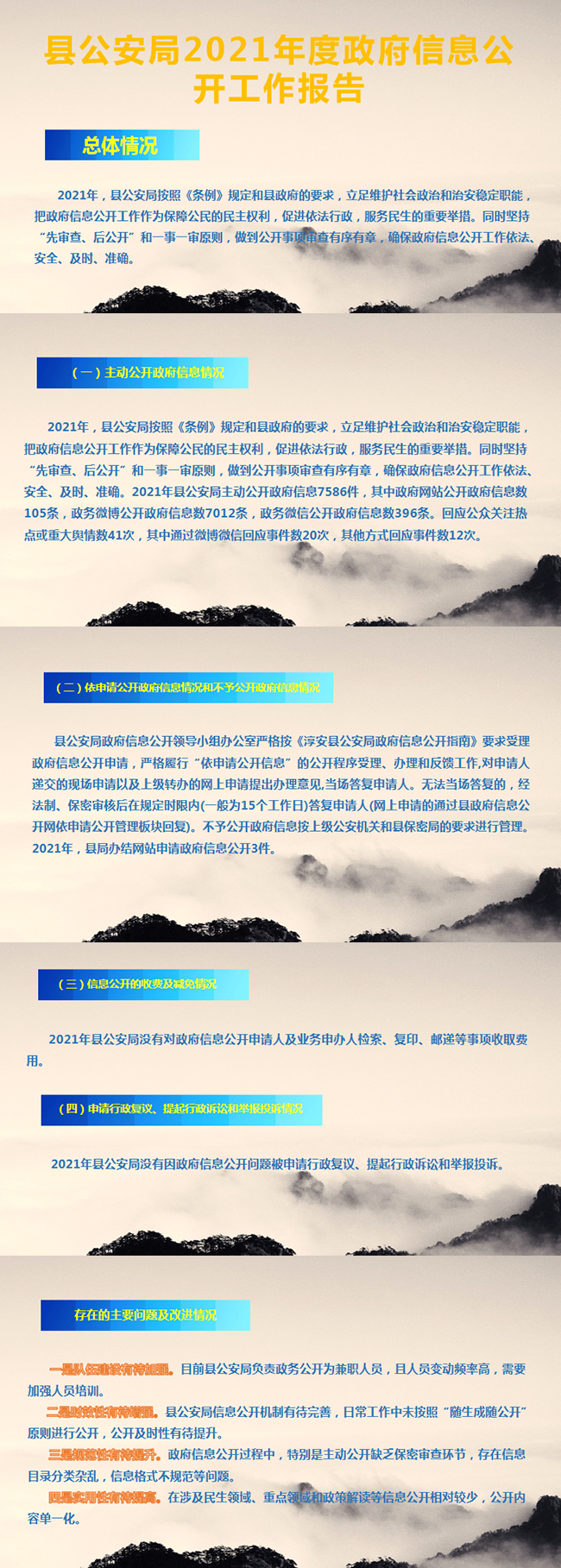 2021年,县公安局按照《条例》规定和县政府的要求,立足维护社会政治和治安稳定职能,把政府信息公开工作作为保障公民的民主权利,促进依法行政,服务民生的重要举措。同时坚持“先审查、后公开”和一事一审原则,做到公开事项审查有序有章,确保政府信息公开工作依法、安全、及时、准确。