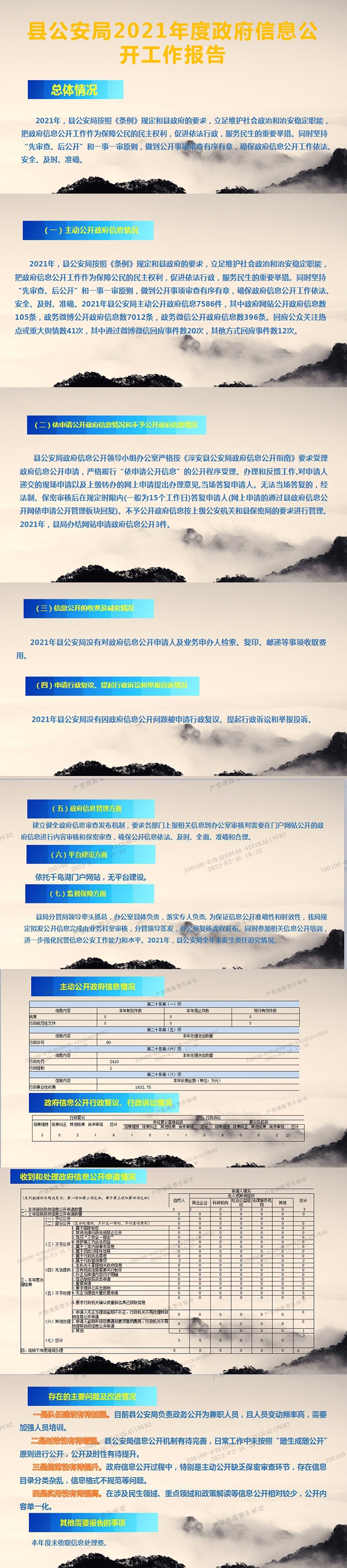 本年度报告是根据《中华人民共和国政府信息公开条例》要求,由县公安局办公室的政府信息公开年度工作情况编制而成。全文由总体情况、主动公开政府信息情况、收到和处理政府信息公开申请情况、因政府信息公开工作被申请行政复议、提起行政诉讼情况、存在的主要问题及改进情况、其他需要报告的事项等六部分构成。本年度报告中所列数据的统计期限从2021年1月1日起到2021年12月31日止。