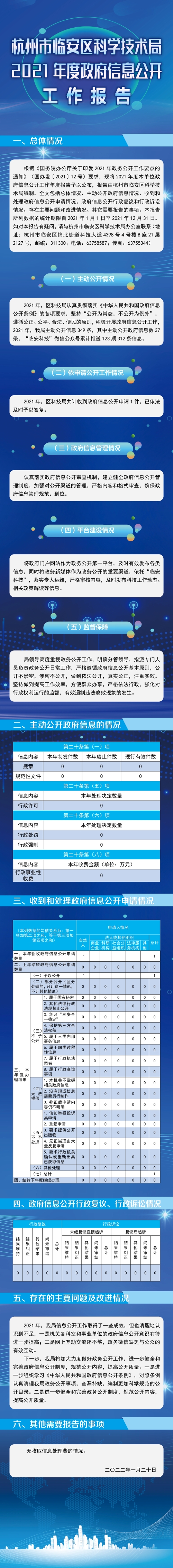 根据《国务院办公厅关于印发2021年政务公开工作要点的通知》(国办发〔2021〕12号)要求,现将2021年度本单位政府信息公开工作年度报告予以公布,报告由杭州市临安区科学技术局编制。全文包括总体情况、主动公开政府信息情况、收到和处理政府信息公开申请情况、政府信息公开行政复议和行政诉讼情况、存在主要问题和改进情况、其它需要报告的事项。本报告所列数据的统计期限自2021年1月1日至2021年12月31日。如对本报告有疑问,请与杭州市临安区科学技术局办公室联系(地址:杭州市临安区锦北街道科技大道4398号4号楼B座21层2127号,邮编:311300;电话:63758587;传真:63755344)