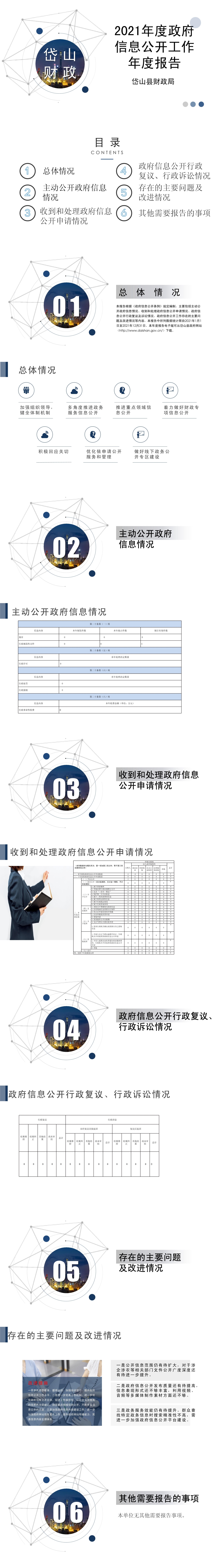 本报告根据《中华人民共和国政府信息公开条例》规定编制,主要包括主动公开政府信息情况、收到和处理政府信息公开申请情况、政府信息公开行政复议及诉讼情况、政府信息公开工作存在的主要问题及改进情况等内容,本报告中所列数据统计限自2021年1月1日至2021年12月31日。本年度报告电子版可从岱山县政府网站(http://www.daishan.gov.cn/)下载。如对本年度报告有任何疑问,请与岱山县财政局办公室联系。联系电话:00580-4486500,通信地址:岱山县高亭镇鱼山大道671号,邮编:316200。