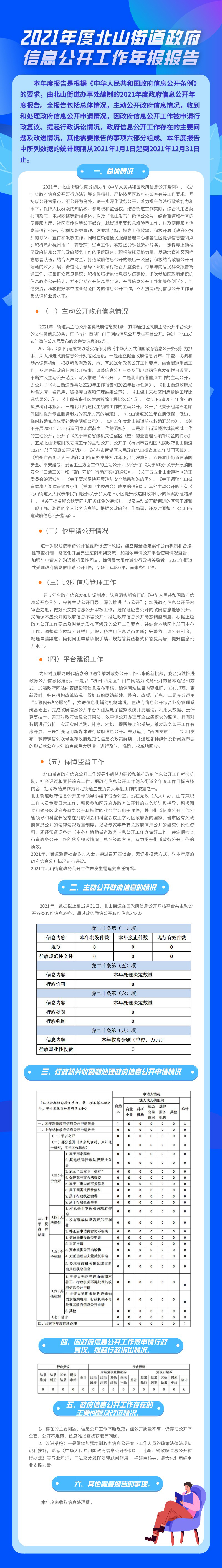2021年,街道共主动公开各类政府信息381条,其中通过区政府主动公开平台公开的文件类信息39条,在“杭州·西湖”门户网站信息公开专栏平台公开。通过“北山发布”微信公众号发布的文件类信息342条。
