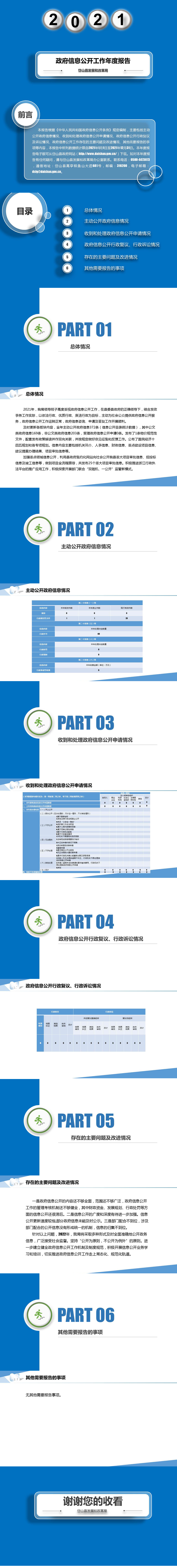 本报告根据《中华人民共和国政府信息公开条例》规定编制,主要包括主动公开政府信息情况、收到和处理政府信息公开申请情况、政府信息公开行政复议及诉讼情况、政府信息公开工作存在的主要问题及改进情况、其他需要报告的事项等内容,本报告中所列数据统计限自2021年1月1日至2021年12月31日。本年度报告电子版可从岱山县政府网站(http://www.daishan.gov.cn/)下载。如对本年度报告有任何疑问,请与岱山县发展和改革局办公室联系。联系电话:0580-4473073,通信地址:岱山县高亭镇鱼山大道681号,邮编:316200,电子邮箱:dsfg@daishan.gov.cn。