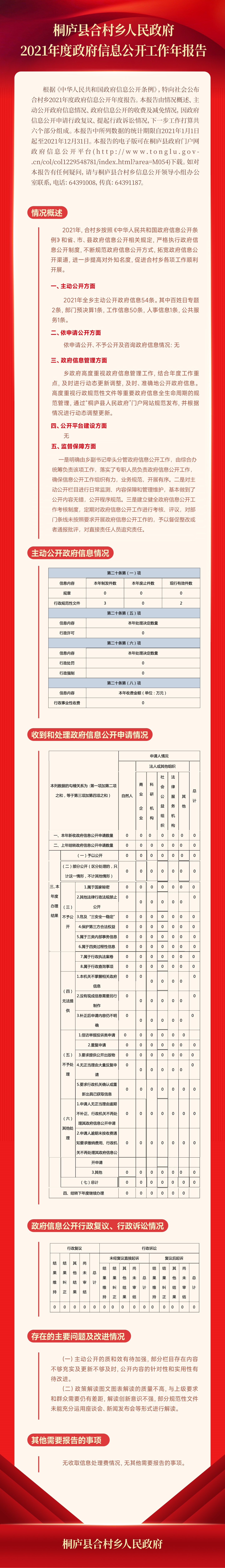 根据《中华人民共和国政府信息公开条例》,特向社会公布合村乡2021年度政府信息公开年度报告。本报告由情况概述、主动公开政府信息情况、政府信息公开的收费及减免情况,因政府信息公开申请行政复议、提起行政诉讼情况,下一步工作打算共六个部分组成。本报告中所列数据的统计期限自2021年1月1日起至2021年12月31日。本报告的电子版可在桐庐县政府门户网政府信息公开平台下载。如对本报告有任何疑问,请与桐庐县合村乡信息公开领导小组办公室联系,电话:64391008,传真:64391187。