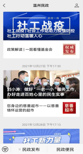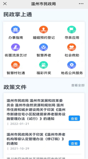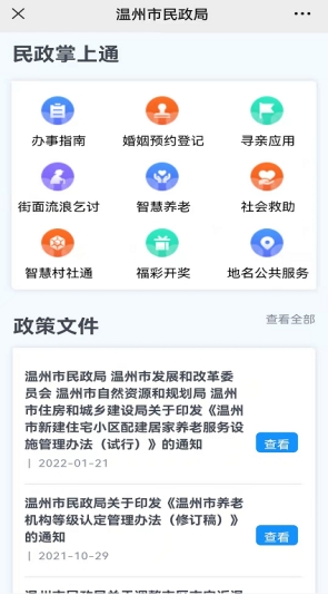 (一)突出数字赋能,多维度丰富公开形式。全面加强民政自媒体建设,在政务服务网、市民政局官网、微博、微信新媒体矩阵基础上,新开设温州民政官方抖音号,做到文字、图片、视频全媒体覆盖,顺应数字化改革时代脉潮,零距离、多层次拓展群众深入了解民政工作的渠道和途径。2021年,市民政局网站(http://wzmz.wenzhou.gov.cn/)统筹整合信息资源,突出重点领域公开,共发布各类动态1768条;“两微”全年发布信息498条,累计阅读量76.8万人次,微信公众号粉丝人数突破11.8万,抖音号单条最高点击量达23.4万次;“智慧村社通”平台已覆盖全市所有村社,注册居民96万人,村社公开信息13.6万条。