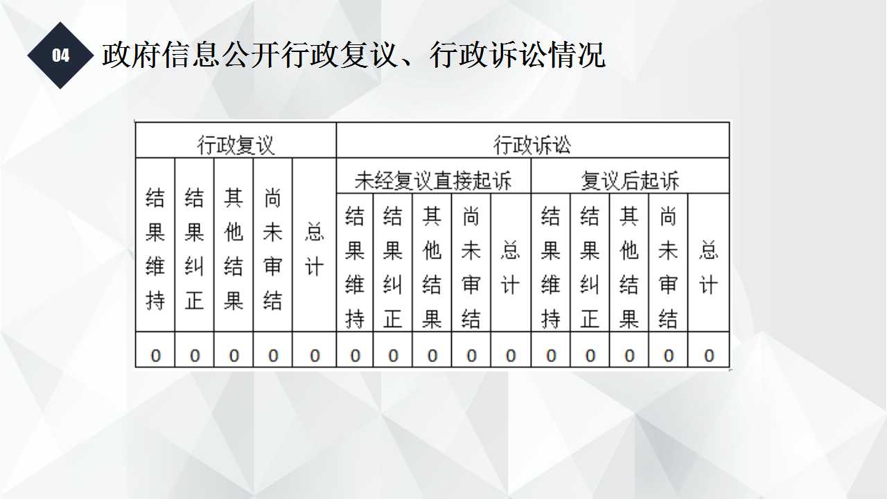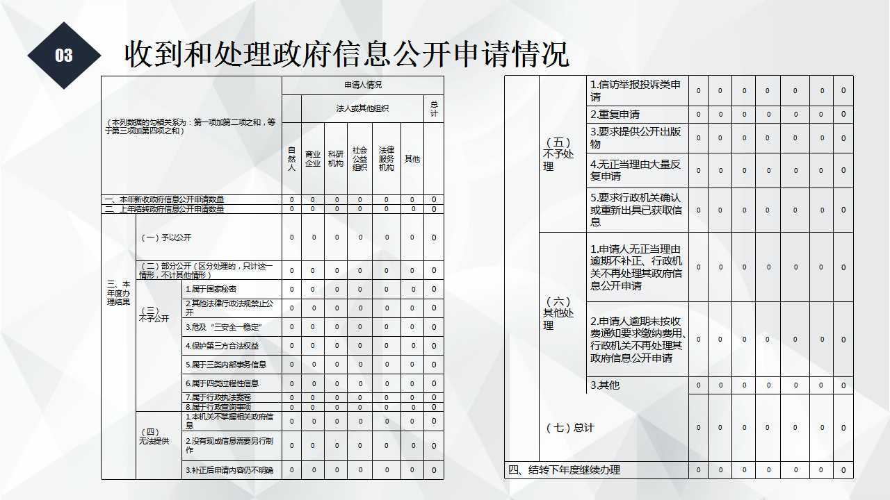 (六)其他处理 | 1.申请人无正当理由逾期不补正、行政机关不再处理其政府信息公开申请 | 0 | 0 | 0 | 0 | 0 | 0 | 0 | |