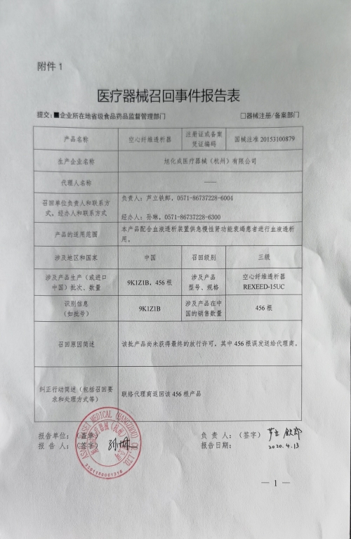 旭化成医疗器械(杭州)有限公司报告,由于其生产的空心纤维透析器(注册证号:国械注准20153100879号)、型号为REXEED-15UC、批号9K1Z1B的产品尚未获得最终的放行许可,其中456根误发送给代理商的原因,旭化成医疗器械(杭州)有限公司对该批产品主动召回。召回级别为三级。详细信息见《医疗器械召回事件报告表》。